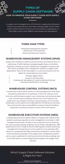 In supply chain management or SCM solution, supply chain software is a type of computer software that helps manage supply chains. These supply chains can be as small as just one business or organization, or they might involve many different businesses and organizations. There three main types of supply chain software: Warehouse Management System (WMS), Warehouse Control System (WCS), and Warehouse Execution System (WES).